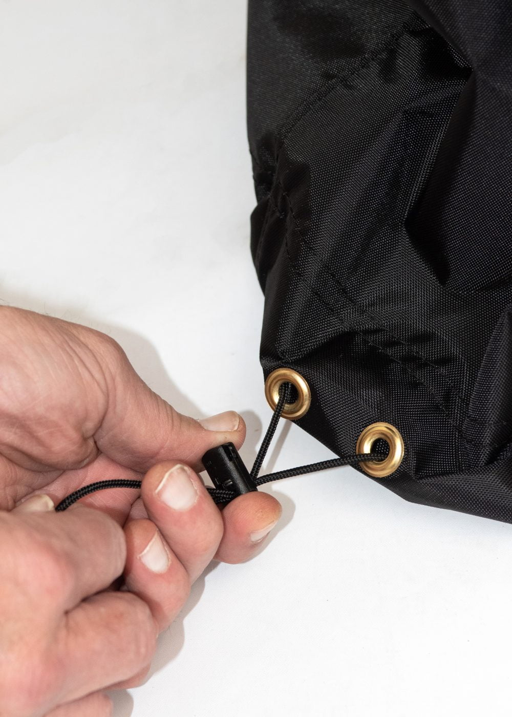 - Utilizes an elastic drawcord with a cord lock to secure onto your vehicle. Grommets for bungee cords or other tie-down materials add extra security.